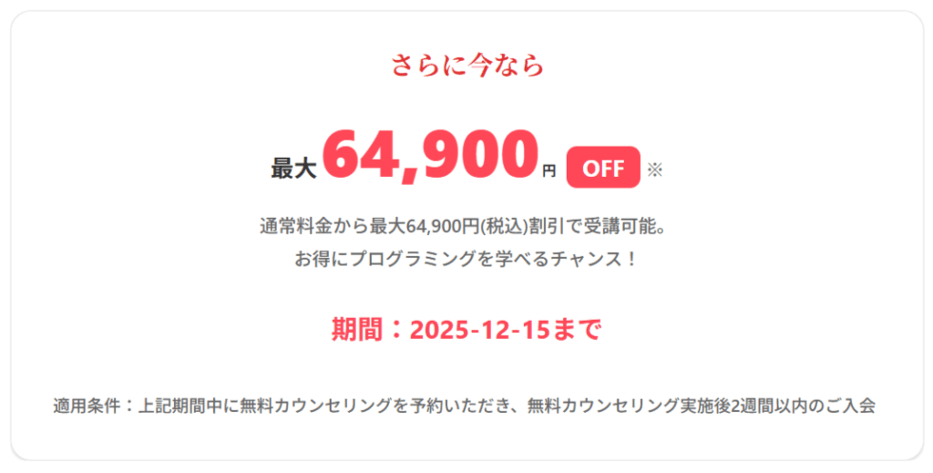 - 12/15までに無料カウンセリングを実施後、2週間以内の入会で通常料金から最大64,900円(税込)割引で受講可能!