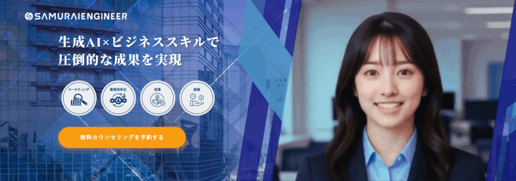 | 学べるスキル | 生成AIの基礎/プロンプト設計/ChatGPT/文章・画像生成/マーケティング・営業・人事での活用法/Python/生成AIアプリ開発/Dify・AIエージェント開発/RAG/外部ツールやAPI連携 など | 生成AIの基礎/プロンプト設計/ChatGPT/文章・資料作成/画像・動画作成/マーケティング・営業での活用法/Python・GAS/生成AIアプリ開発/Dify/副業での実践スキル など | 生成AIの基礎/プロンプト設計/ChatGPT/文章・資料作成/画像・動画作成/マーケティングでの活用法/生成AIアプリ開発/API連携/Python/データサイエンス など | 画像・動画・音声処理と生成/データ分析/Python/AIアプリ開発/データサイエンス/E資格対策 など | データ分析/Python/AIアプリ開発/データサイエンス など |