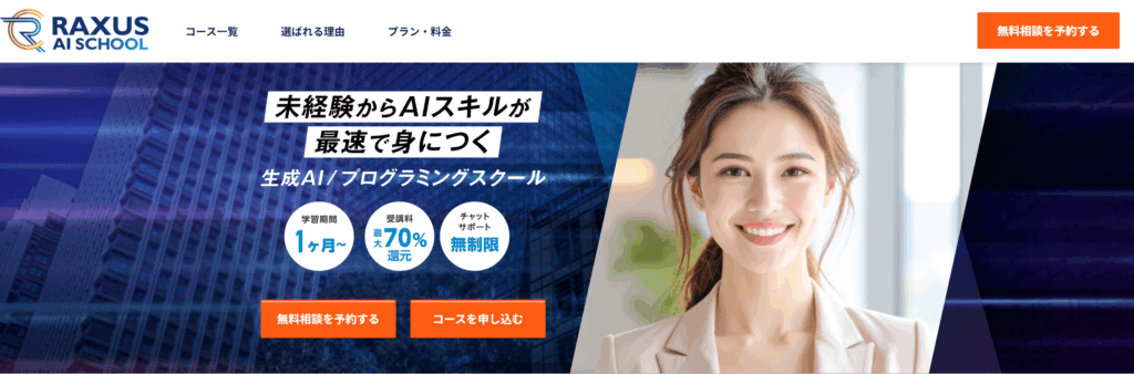 | スクール名 | DMM 生成AI CAMP | 侍エンジニア | RAXUS AIスクール | Aidemy Premium | キカガク |